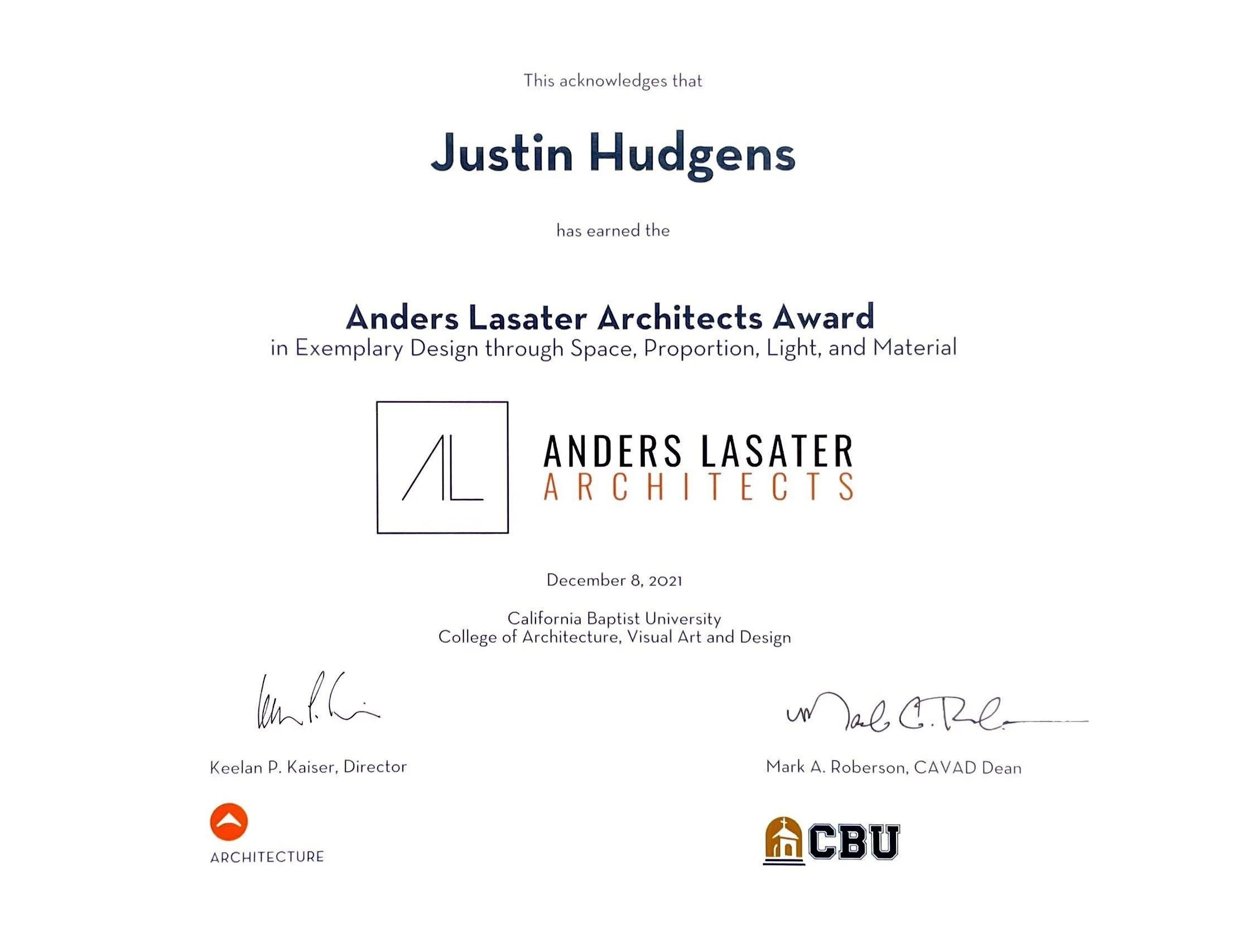 This project was one of two winners in a studio wide design competition. It was awarded with a small scholarship and recognition by the architect sponsor Anders Lasater.